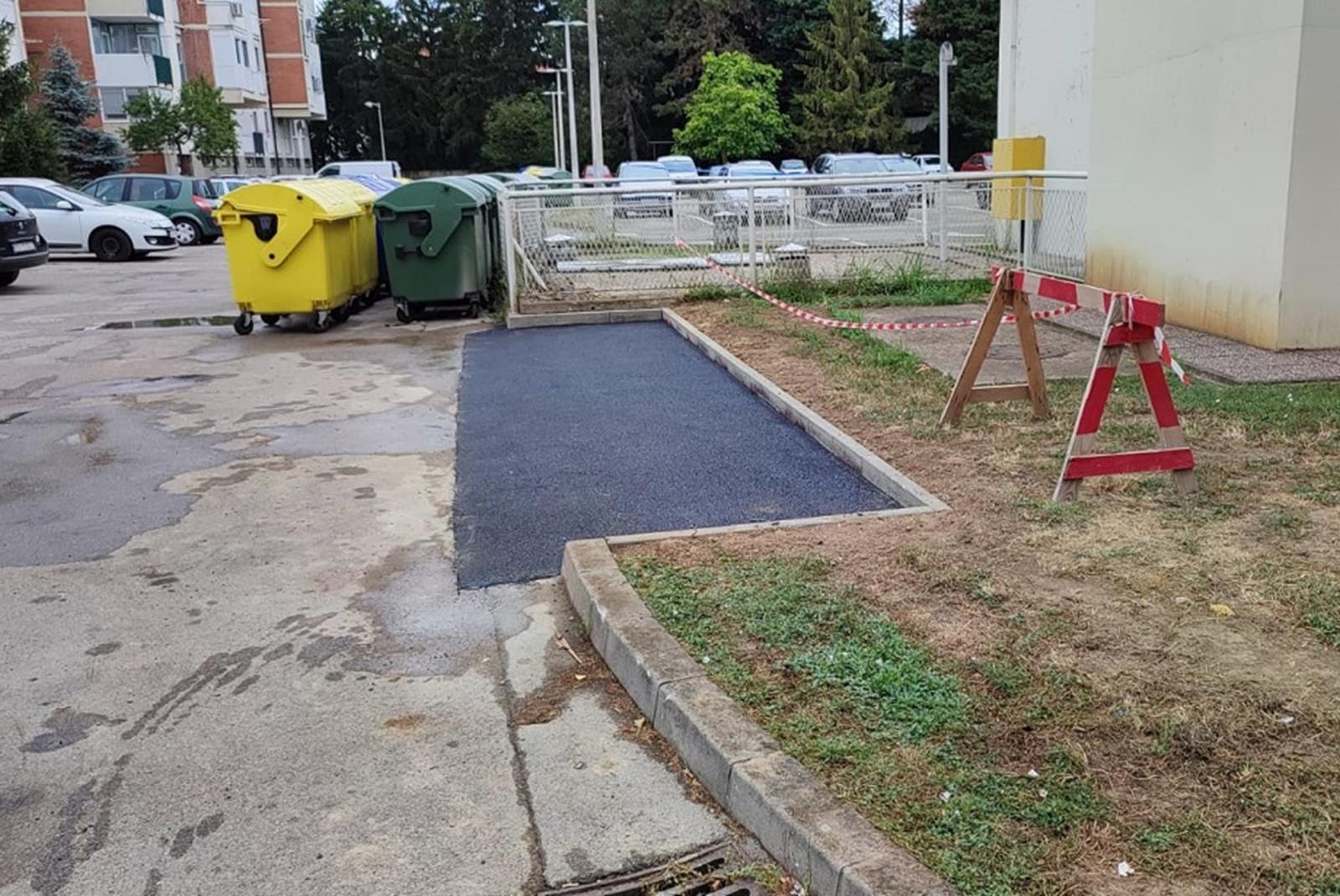 Radnici Komunalca dovršili su radove na uređenju površine za kontejnere na dvije lokacije u Slavonskoj ulici. U sklopu radova postavljeno je 26 metara rubnjaka i asfaltirano ukupno 40 m² površine za kontejnere.